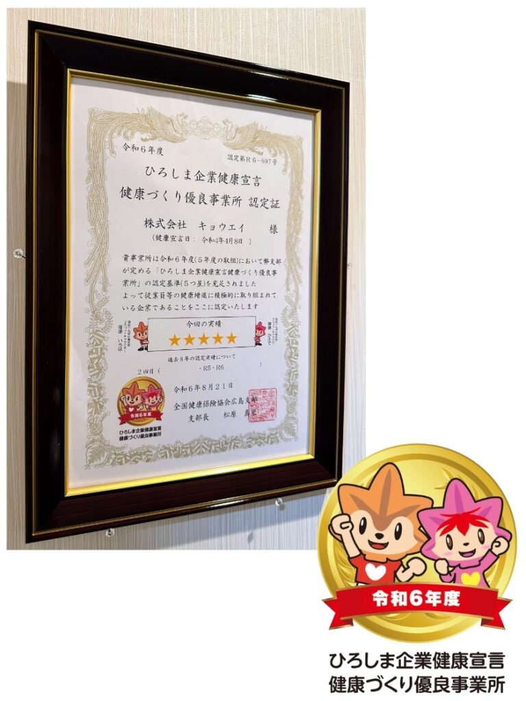 「広島企業健康宣言」において、2年連続で最高評価のゴールド認定をいただきました!昨年からスタートしたこの取り組みにおいて、2年連続で最高評価をいただけたことは、社員一同にとって大きな励みとなっています。